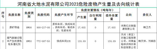 河南省大地水泥有限公司2023危險(xiǎn)廢物產(chǎn)生量及去向統(tǒng)計(jì)表