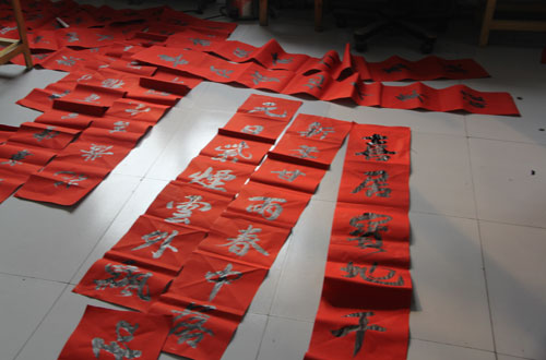 1月24日,在新春佳節(jié)來(lái)臨之際,河南大地集團(tuán)邀請(qǐng)部分國(guó)家級(jí)、省級(jí)書(shū)法家協(xié)會(huì)會(huì)員到集團(tuán)義寫(xiě)春聯(lián),為廣大員工送去新春的祝福。 紅春聯(lián),紅笑臉。在義寫(xiě)春聯(lián)現(xiàn)場(chǎng),應(yīng)廣大員工所需,書(shū)法家們凝神靜氣,揮毫潑墨,揮就一幅幅筆酣墨飽、寓意深刻的新春佳聯(lián),大紅的福字,吉祥的喜字,構(gòu)成一道獨(dú)特的年俗文化風(fēng)景線。活動(dòng)持續(xù)三個(gè)多小時(shí),300多幅春聯(lián)被大家一搶而空。 “還是手寫(xiě)的春聯(lián)最有年味兒。”一幅幅不同風(fēng)格的春聯(lián)讓聞?dòng)嵍鴣?lái)的廣大員工喜笑顏開(kāi),贊口不絕。