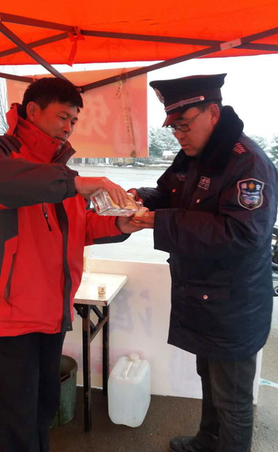 工作間隙,可敬的環(huán)衛(wèi)老人放下手中的掃帚,喝杯富平春暖暖身