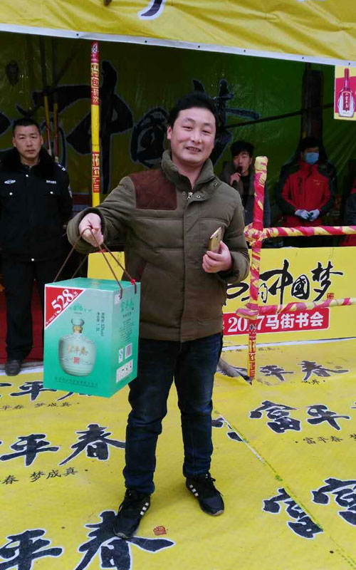 一位老人沉醉在品味美酒之中 同時(shí),開展掃碼抽大獎(jiǎng)活動(dòng),共設(shè)置七個(gè)獎(jiǎng)項(xiàng),最高獎(jiǎng)項(xiàng)為價(jià)值528元富平春尊品原漿一壇,數(shù)萬份獎(jiǎng)等你拿,綜合中獎(jiǎng)率達(dá)98%。書會(huì)現(xiàn)場開展的系列活動(dòng)不斷吸引著四面八方的來客蜂擁而來,掃碼的、抽獎(jiǎng)的、品酒的,火爆場面嗨翻天;開展你有宴席我送禮活動(dòng),凡在馬街書會(huì)現(xiàn)場,預(yù)訂2017年宴席活動(dòng)的,當(dāng)場送價(jià)值528元尊品原漿1壇,并有豪禮相送,不斷為未婚青年送禮包,送驚喜,送實(shí)惠;開展停車送酒活動(dòng),為廣大趕會(huì)群眾提供停車點(diǎn),每停一輛車送停車券一張,憑停車券可免費(fèi)領(lǐng)取富平春F6一小瓶;開展金雞迎春買贈(zèng)酬賓活動(dòng)。凡在馬街書會(huì)期間,購買富平春華貴、F6、F3等酒品者,贈(zèng)吉祥物金雞一個(gè),恭祝金雞獻(xiàn)瑞,新年大吉!……
