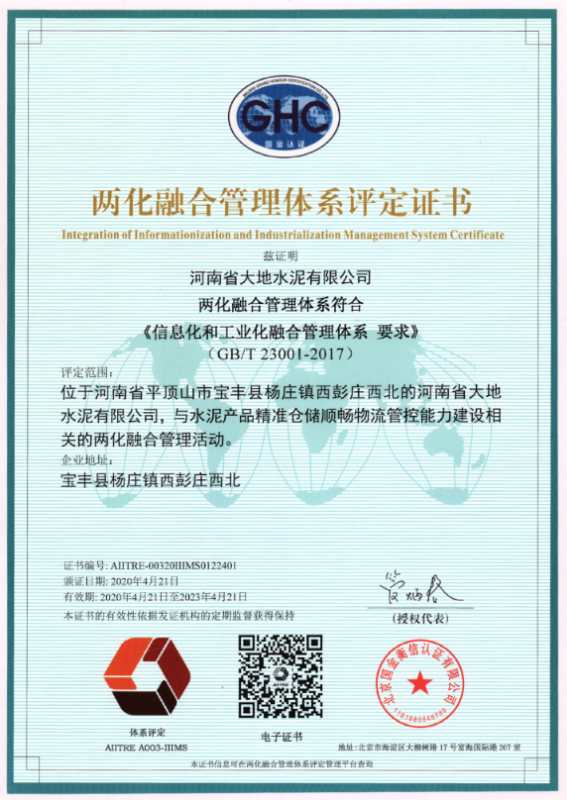 首頁(yè) >> 走進(jìn)大地 >>資質(zhì)榮譽(yù) >> 河南省大地水泥有限公司通過(guò)兩化融合管理體系認(rèn)證