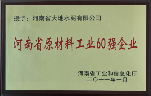 首頁 >> 走進大地 >>資質(zhì)榮譽 >> 河南省原材料工業(yè)60強